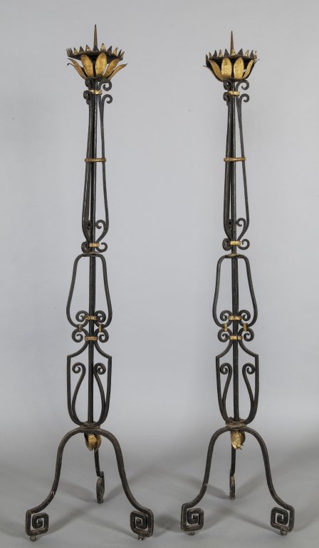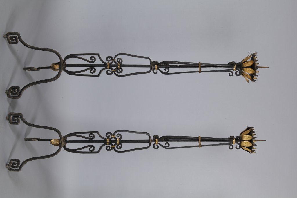 Coppia di torciere in ferro brunito e dorato,fine sec. XVIII