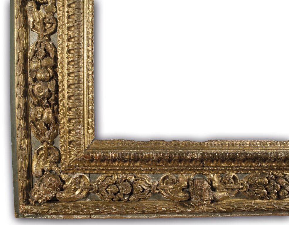 Grande ed impressionante cornice in legno finemente intagliato, laccato e dorato con teste muliebri e ghirlande, Roma sec. XVII