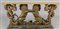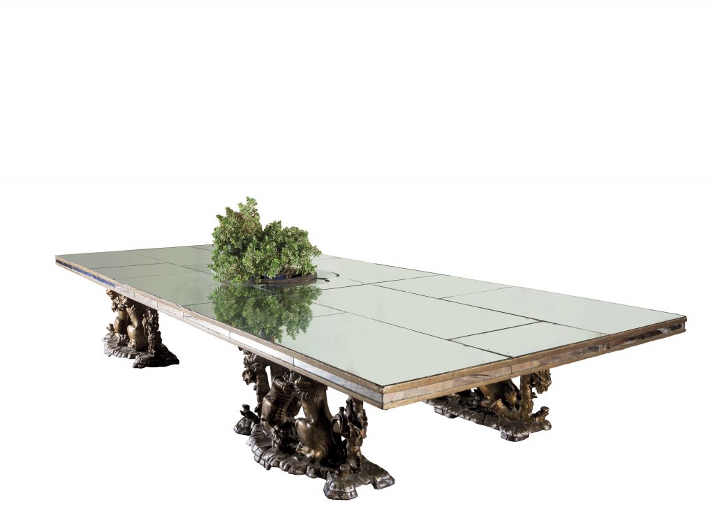 Grande tavolo in specchio con base formata da quattro gruppi ligneii dorati...