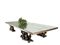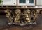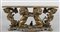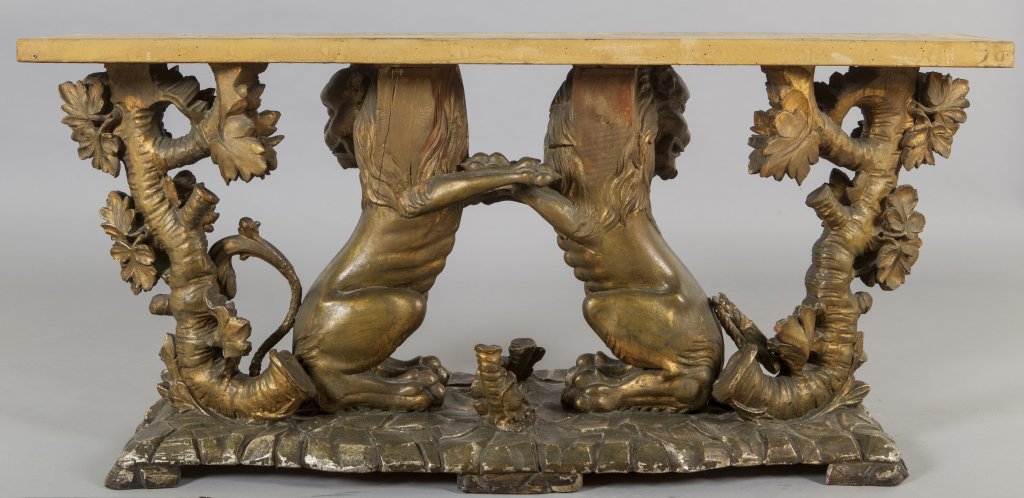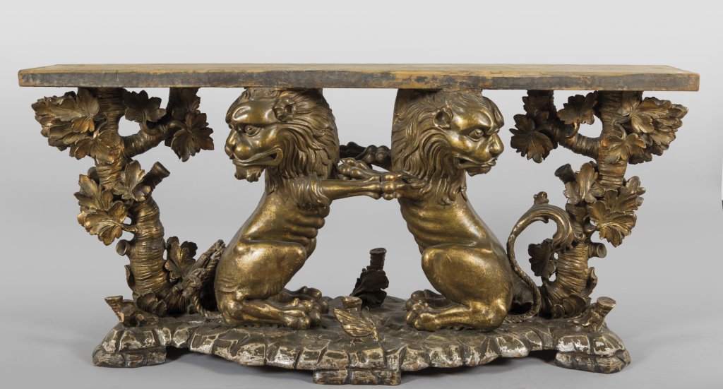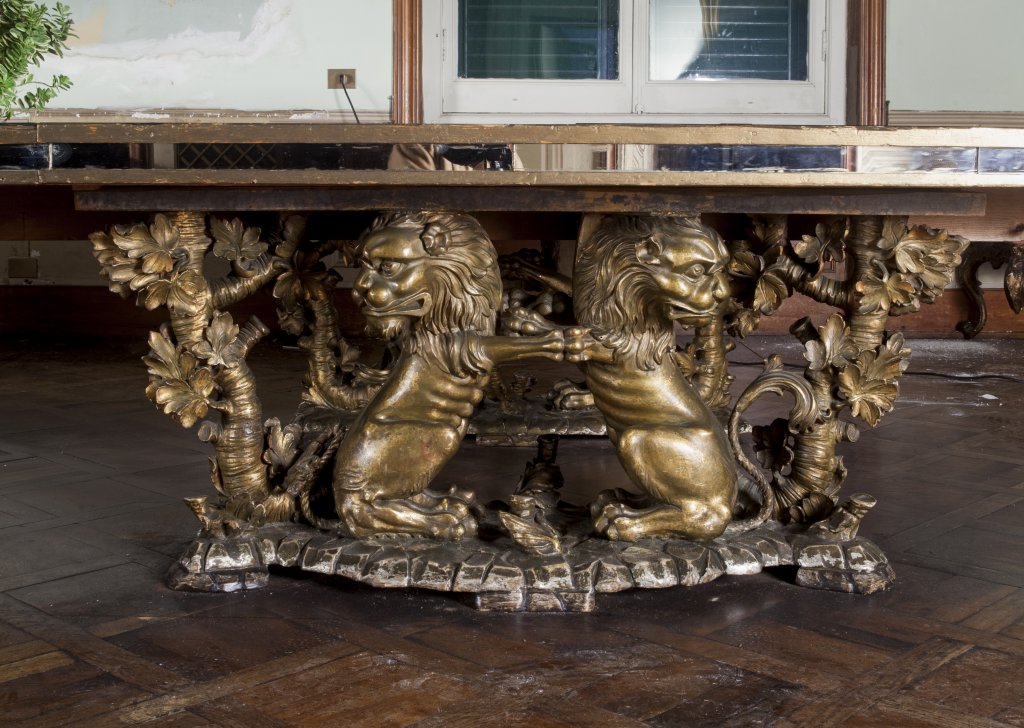 Grande tavolo in specchio con base formata da quattro gruppi ligneii dorati raffiguranti leoni rampanti