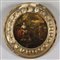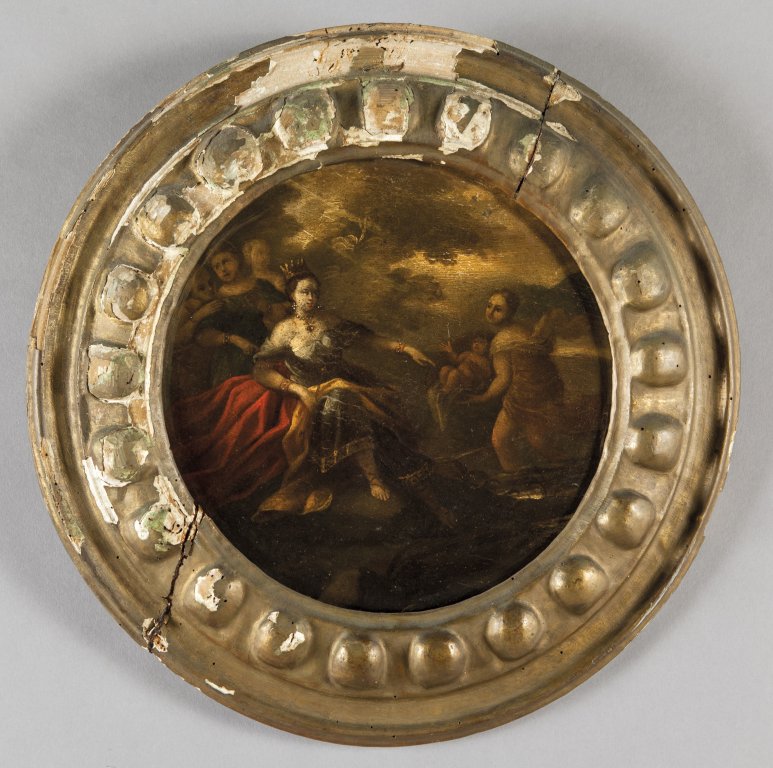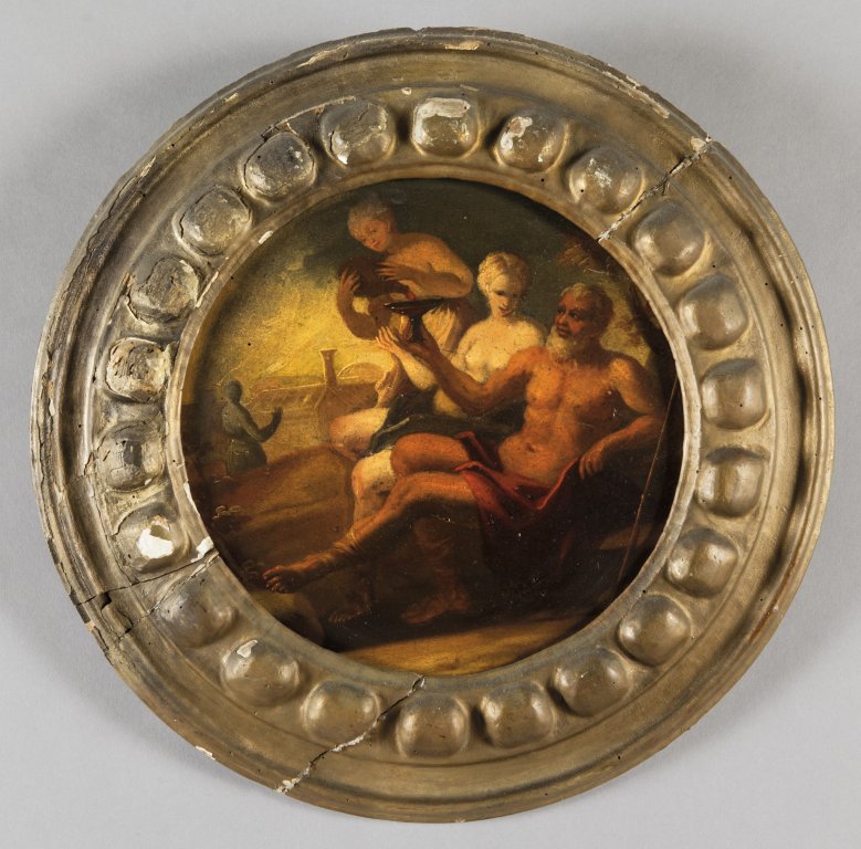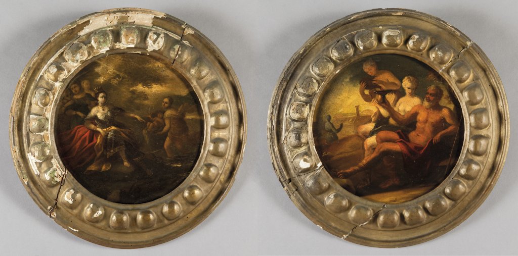 Scuola italiana sec.XVII "Mosé salvato dalle acque" e "Lot e le figlie" coppia di olii su tavola di forma rotonda, cornici coeve in legno dorato