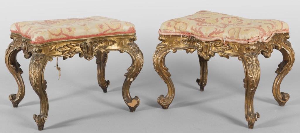 Coppia di panche ad un posto in legno finemente intagliato e dorato, Roma sec.XIX (difetti e mancanze)