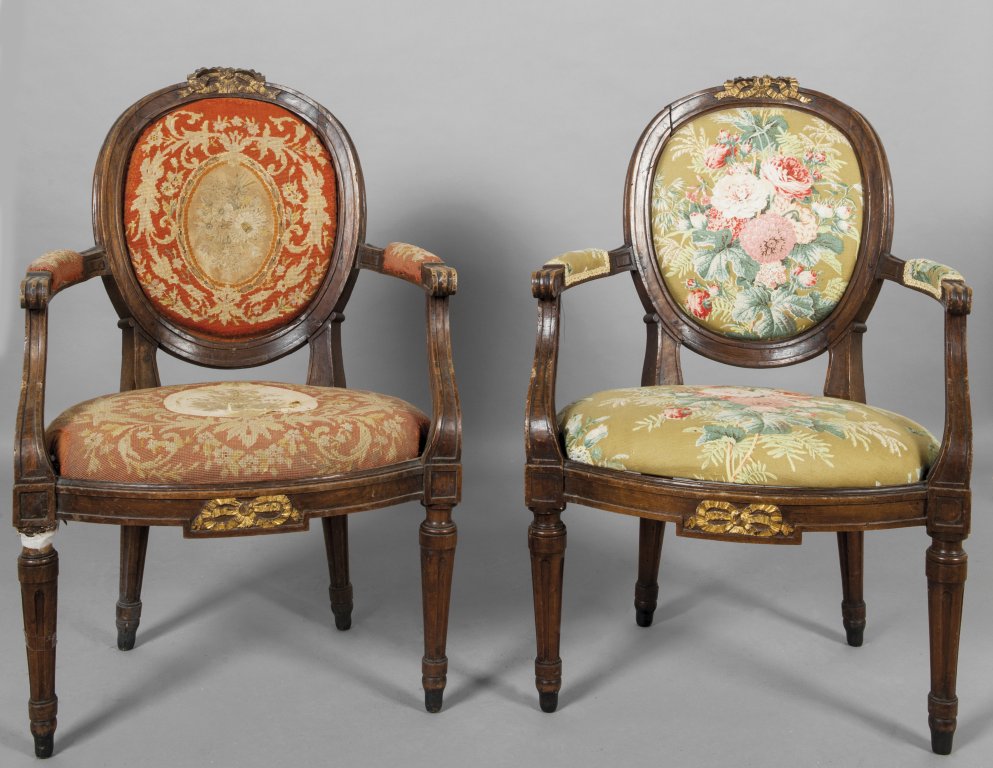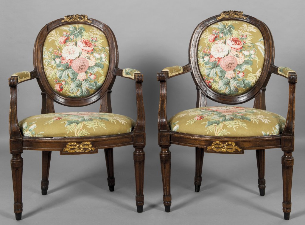 Quattro poltrone Luigi XVI in noce, schienale ovale, cimasa con nastrini dorati