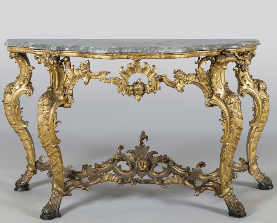 Console Luigi XV in legno finemente intagliato e dorato, gambe mosse raccordate da traversa con mascherone, Genova I metà sec.XVIII