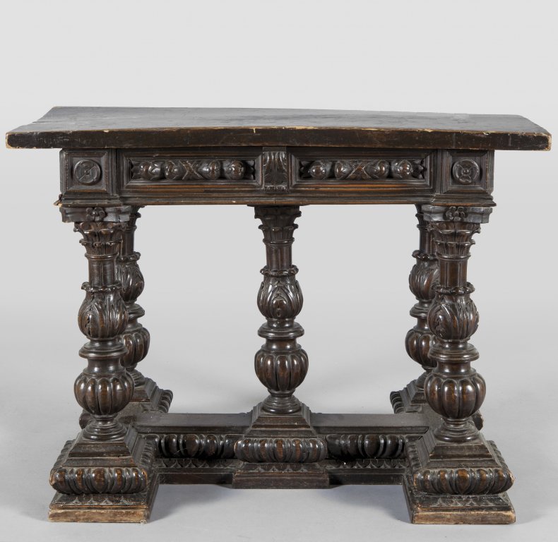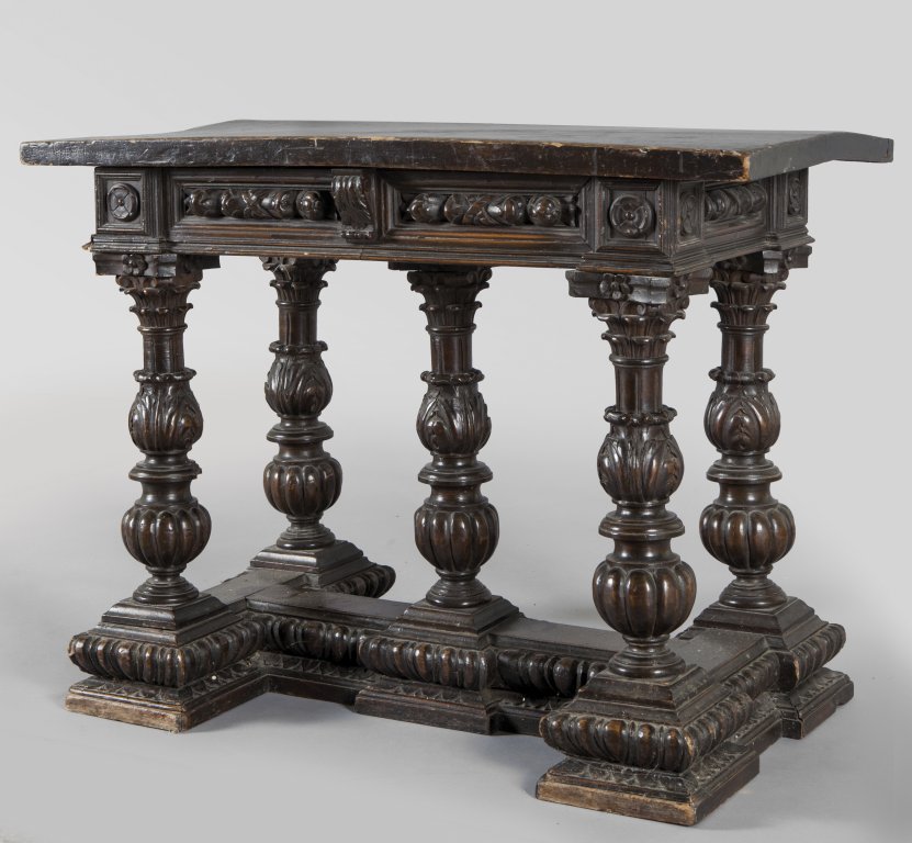 Lot 124 | Tavolo in noce in stile rinascimentale, cinque gambe a balaustra unite da...