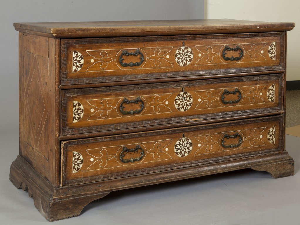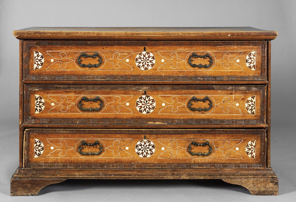 Canterano a tre cassetti in noce intarsiato in avorio, Veneto sec.XVII