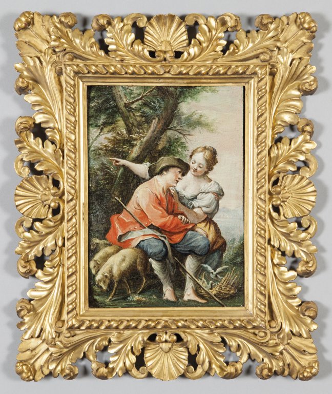 Scuola veneta sec.XVIII "Idillio campestre" olio su tavola, cornice in legno intagliato e dorato