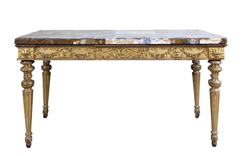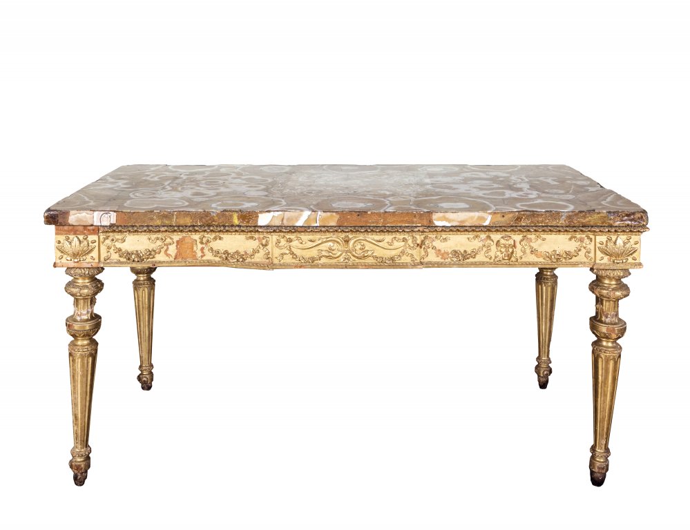 Coppia di grandi consoles Luigi XVI in legno intagliato e dorato con fregi a festoni e mascheroni, piani lastronati in onice archeologica, Genova metà sec. XVIII (danni e mancanze)