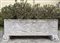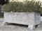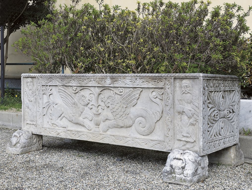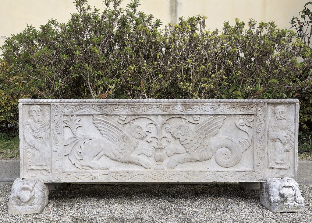 Vasca portafiori ricavata da un unico blocco in marmo scolpito sui quattro lati, frontale con grifoni e figure nei montanti