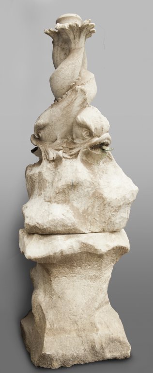 Parte superiore di fontana in marmo raffigurante tre delfini poggianti su una roccia, Genova sec.XVIII