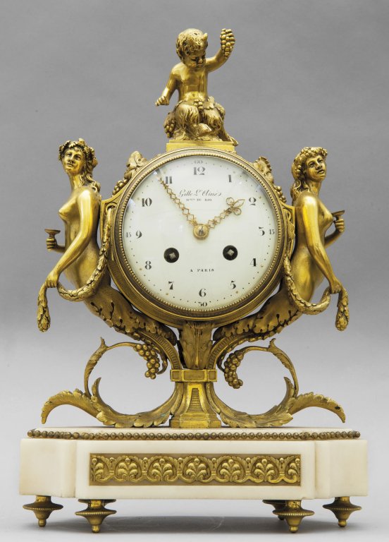Orologio da camino in bronzo dorato e marmo, f.to Gille L'Aine M.Er Du Roy Parigi, macchinario firmato, Francia sec. XVIII
