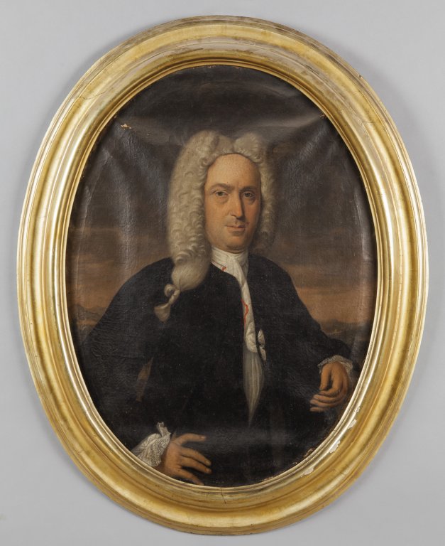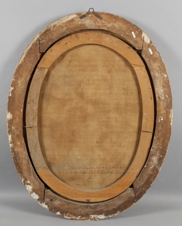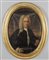 Scuola genovese secolo XVIII "Ritratti di gentiluomini" coppia di olii di forma ovale in cornici in legno dorate coeve (nel retro di uno "Ritratto di Sanguineti" luglio 1731)