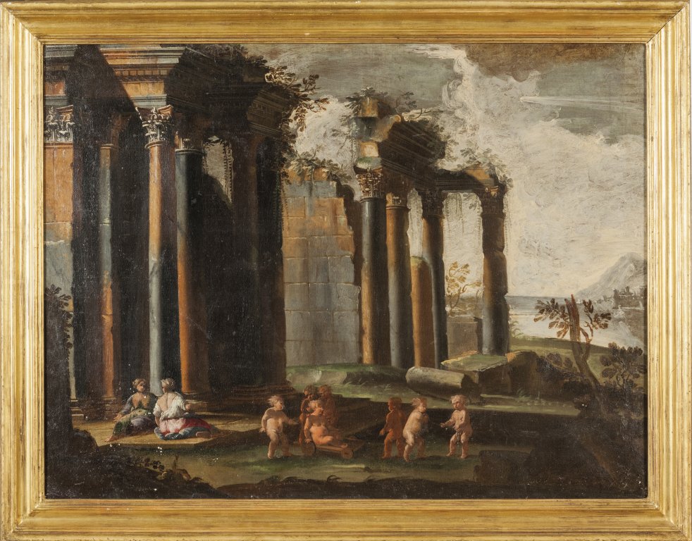 Alberto Carlieri (1672-1725 circa) "Capriccio architettonico con satiro e baccanti" e "Capriccio architettonico con scherzi di putti" coppia di olii