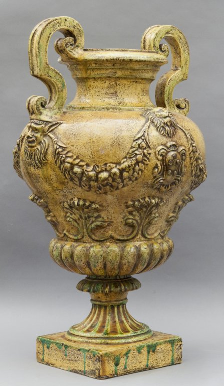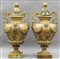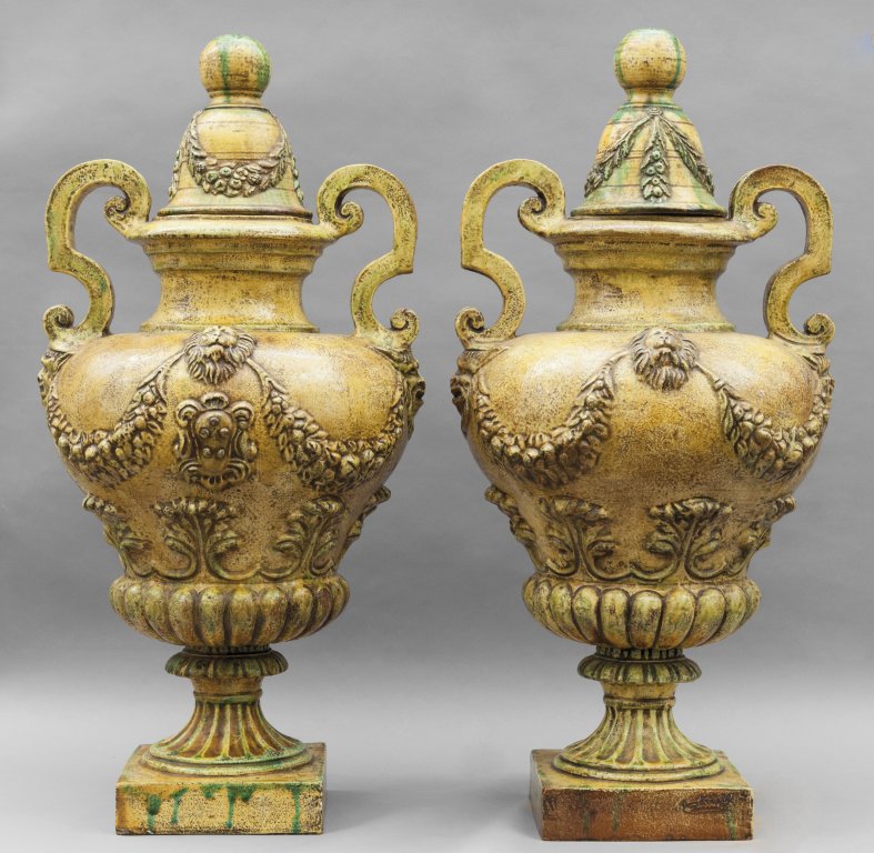 Coppia di grandi vasi con coperchio in terracotta color ocra con decorazioni in rilievo, sec.XIX