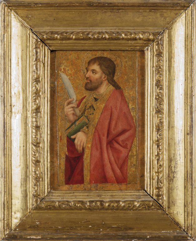 "Le due tavolette, raffiguranti San Giacomo Maggiore e San Bartolomeo, individuati dai rispettivi tradizionali attributi iconografici, dovevano trovare posto alle stremità della predella oggi scomposta di un polittico, come dimostrano la posizione delle figure, le ridotte dimensioni e la particolare foggia del supporto i dati di fabbrica indicano, inoltre, che le opere facevano in origine parte della seri di Apostoli di Antoine de Lonhy (San Matteo, San Tommaso, San Pietro, San Giacomo minore, San Simone e Sant'Andrea), giunta incompleta nelle raccolte del Museo Civico di Arte Antica e Palazzo Madama di Torino: conducono a questa constatazione la quasi perfettas coincidenza delle misure (per tutte le otto tavoletta cm.20x29 circa) e la corrispondenza , altrettanto puntuale, della decorazione punzonata del fondo oro che, per quanto nella coppia di dipinti qui esaminate sia integrato dai restauri, presenta u identico profilo decorativo lungo le aureole. Anche i dati stilistici convalidano l'appartenenza delle due opere al complesso oggi a Torini e, soprattutto, la loro attribuzione all'artista borgognone, che dopo un fortunato periodo di attività ad Autun Tolosa e Barcellona come pittore, miniatore e maestro vetraio, si trasferisce, dopo il 1462, negli stati del duca di Savoia, dove diventa, fino alla fine del secolo, l'indiscusso protagonista del panorama pittorico locale. Nei due Santi si individua infatti la vigorosa, e, a tratti, rude caratterizzazione delle fisionomie che, come sempre nelle opere dell'artista, si accompagna a una straodinaria delicatezza ed intensità della gamma cromatica: il profilo pensoso e un poco arcigno del San Giacomo rimanda al San Matteo di Palazzo Madama così come al Simon Mago della frammentaria Caduta di Simon Mago (Aosta, Tesoro della collegiata dei Santi Pietro e Orso) e ai Santi benedettini affrescati nel presbiterio della chiesa abbaziale della Novalesa il bonario San Bartolomeo, trova invece riscontro nel San pietro oggi a Torino, nei Profeti della Novalesa e nel San Giuseppe della Natività del Museum Mayer van der Bergh di Anversa. Corrobora ulteriormente il riferimento delle due tavole ad Antoine de Lonhy, la selezione raffinata della gamma cromatica che accosta, secondo uno schema tipico dell'artista anche nella sua produzione miniata, il rosa lilla al verde mela, al rosso aranciato e al grigio viola rialzati e riscaldati dall'oro che impreziosisce i particolari dell'abbigliamento.
