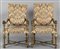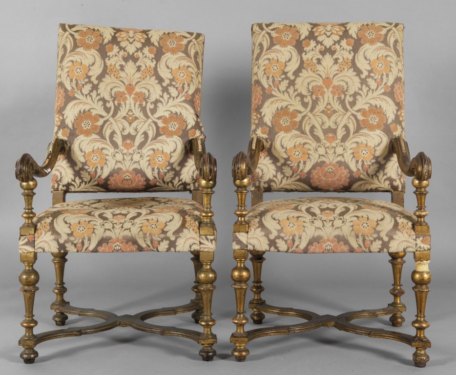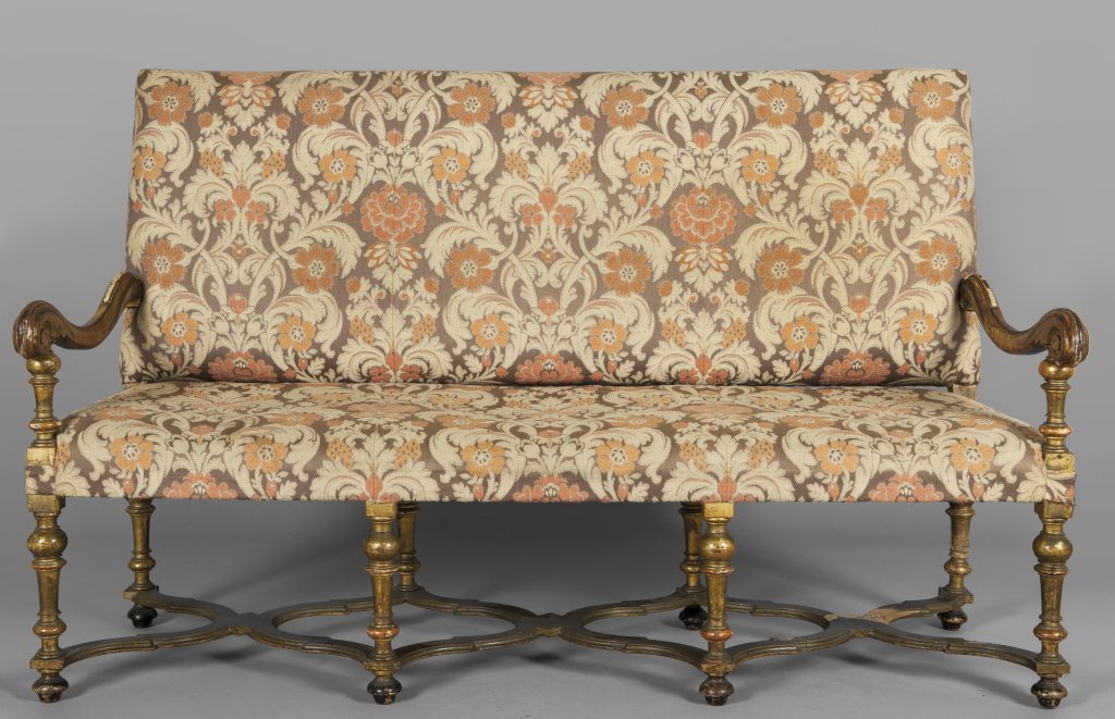 Due divani e quattro poltrone in noce, gambe a bottiglia raccordate da traverse, Piemonte sec.XVII (dorate nel sec.XIX, rotture e mancanze)