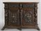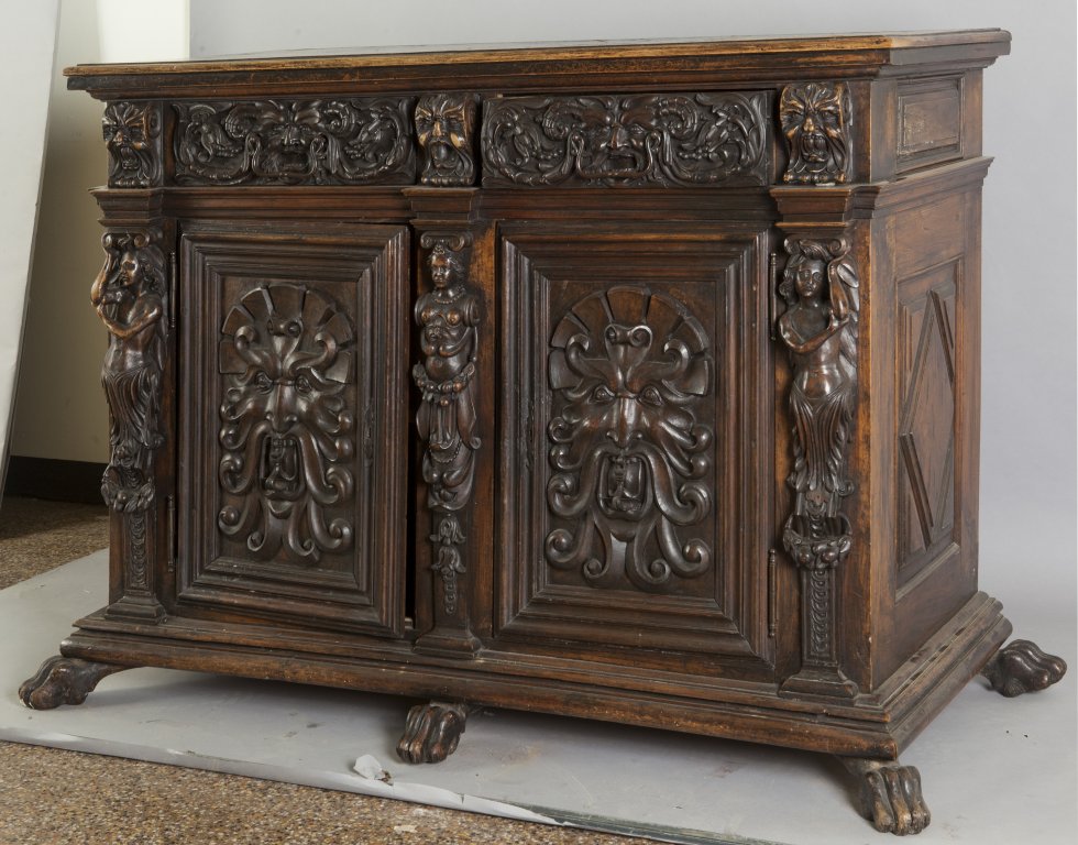 Credenza a due sportelli e due cassetti riccamente intagliata con mascheroni e lesene, sec. XIX