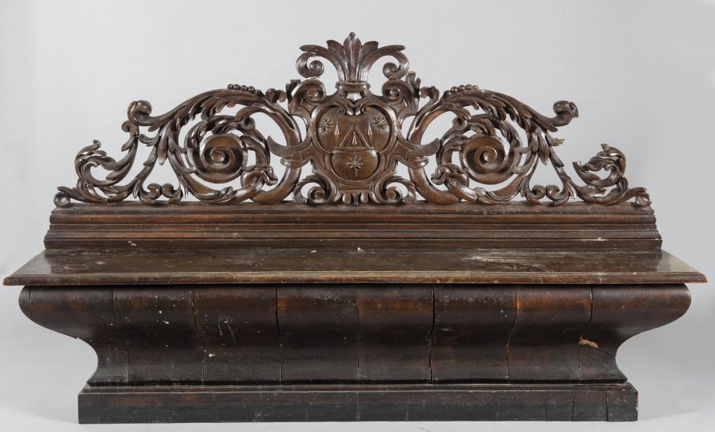 Lot 230 | Panca da ingresso in noce con cimasa intagliata con stemma centrale (elementi...