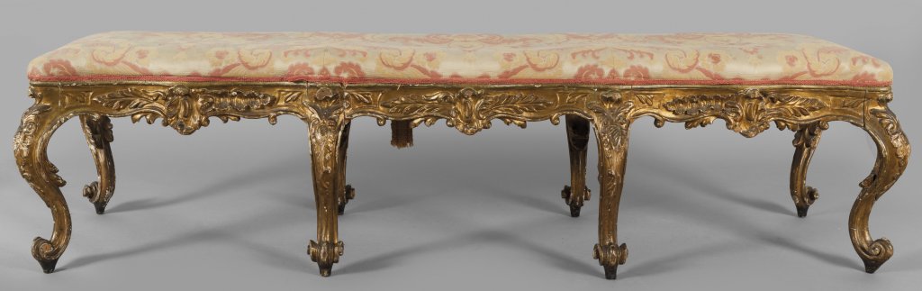 Coppia di panche a tre posti in legno finemente intagliato e dorato, Roma sec. XIX (difetti e mancanze)