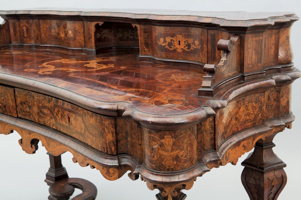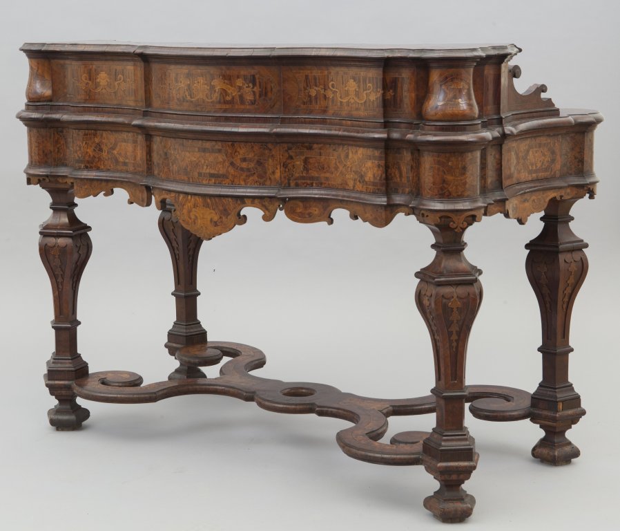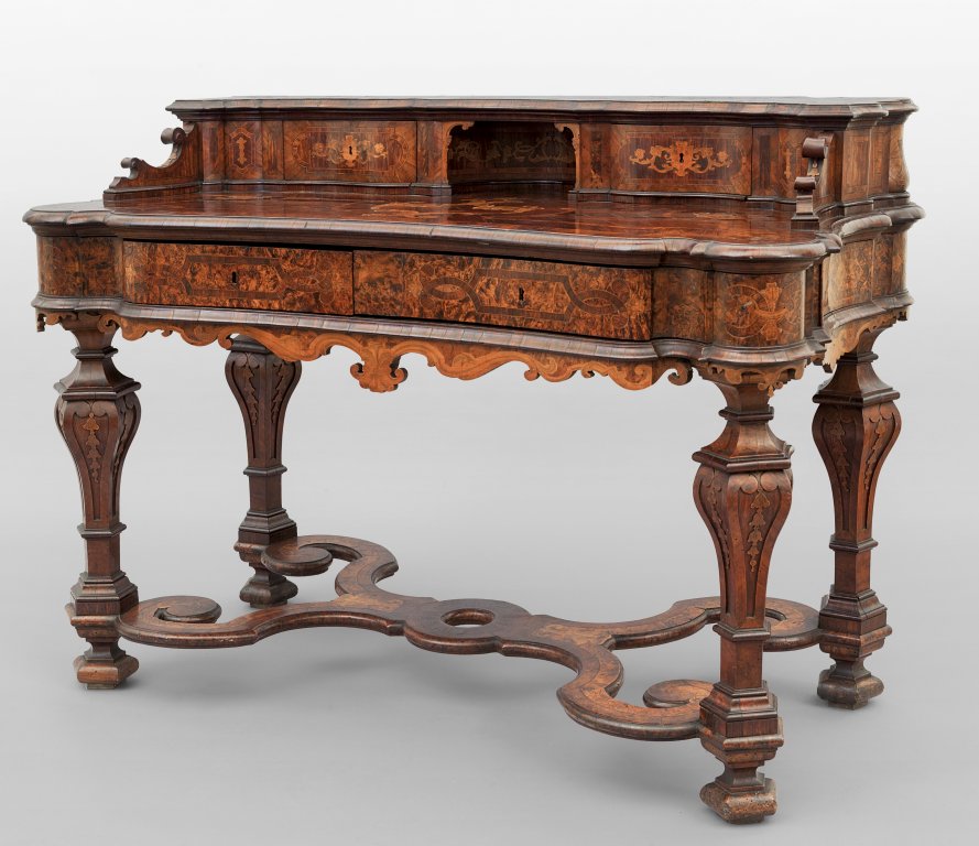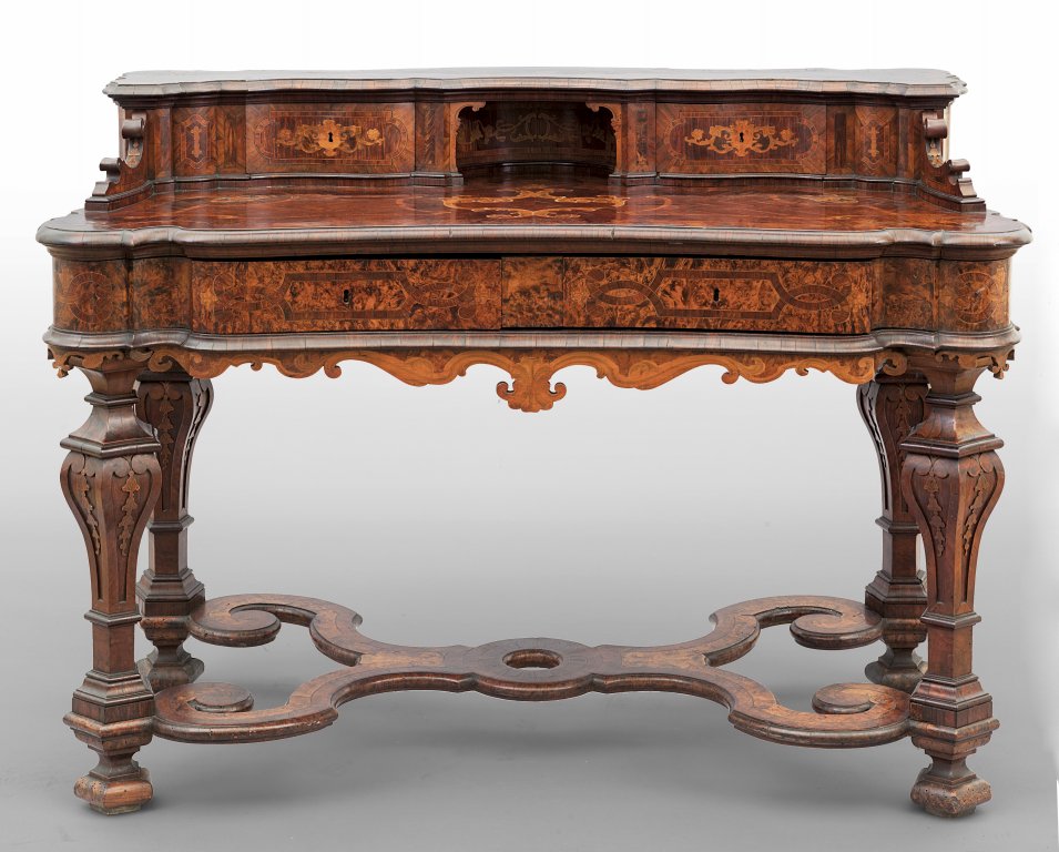 Scrittoio Luigi XIV da centro lastronato in palissandro e radica ed intarsiato e filettato in acero, movimentato sul fronte, nel retro e sui fianchi, cassetti segreti, alzata con cassetti e scomparti, Roma fine sec.XVII
