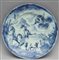Piatto in maiolica bianca e blu con al centro cavaliere con cane, marca...
