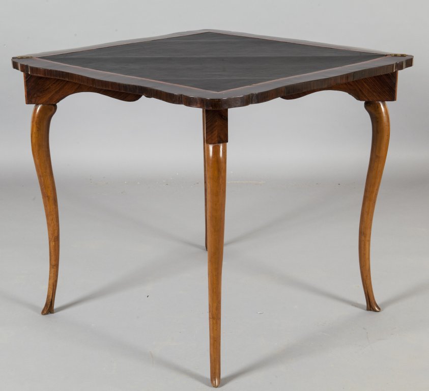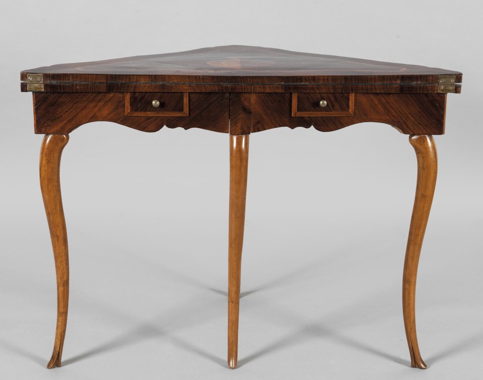 Tavolino da gioco lastronato in palissandro, filettato in bois de rose con il classico motivo del cuore sul piano, Genova I metà sec.XVIII