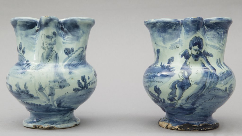 Coppia di piccoli versatoi in ceramica, decorazione bianca e blu con putti e personaggi, marca Corona, Savona sec.XVIII