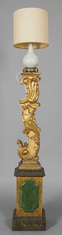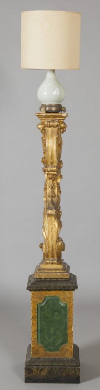 Antico elemento in legno dorato sormontato da un vaso in porcellana di Cina adattato a lampada