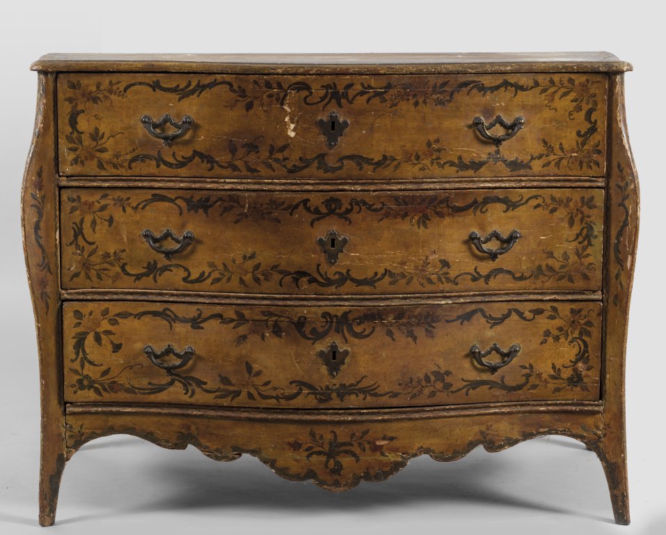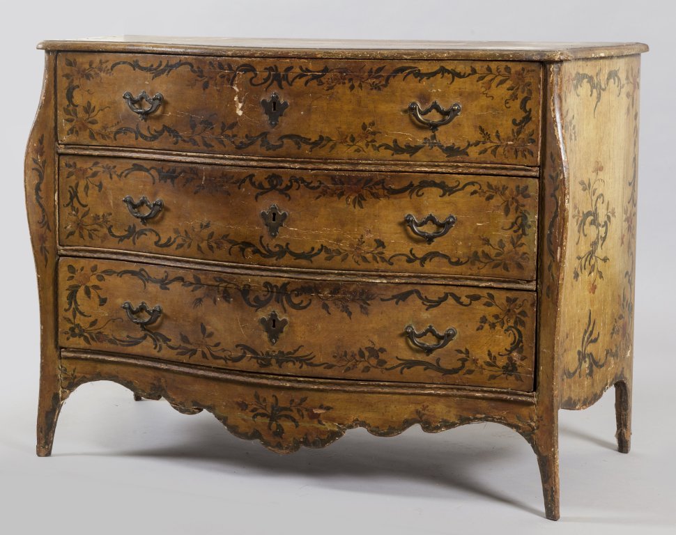 Comò Luigi XIV dipinto in policromia a fiori su fondo chiaro, Genova, I metà sec.XVIII