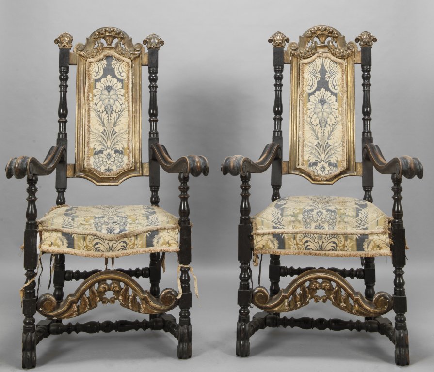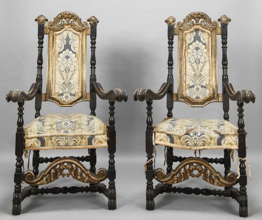 Sei seggioloni con braccioli in noce, con fregi dorati, Toscana sec.XIXdifetti