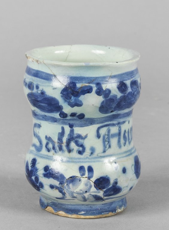 Piccolo albarello in ceramica di Savona con decorazione bianca e blu, sec.XVIII