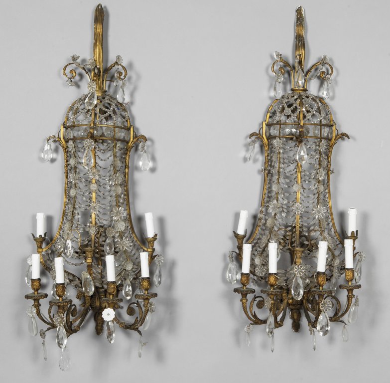 Coppia di apliques in stile Luigi XVI a 6 luci in bronzo dorato e cristalli, Francia sec. XIX