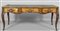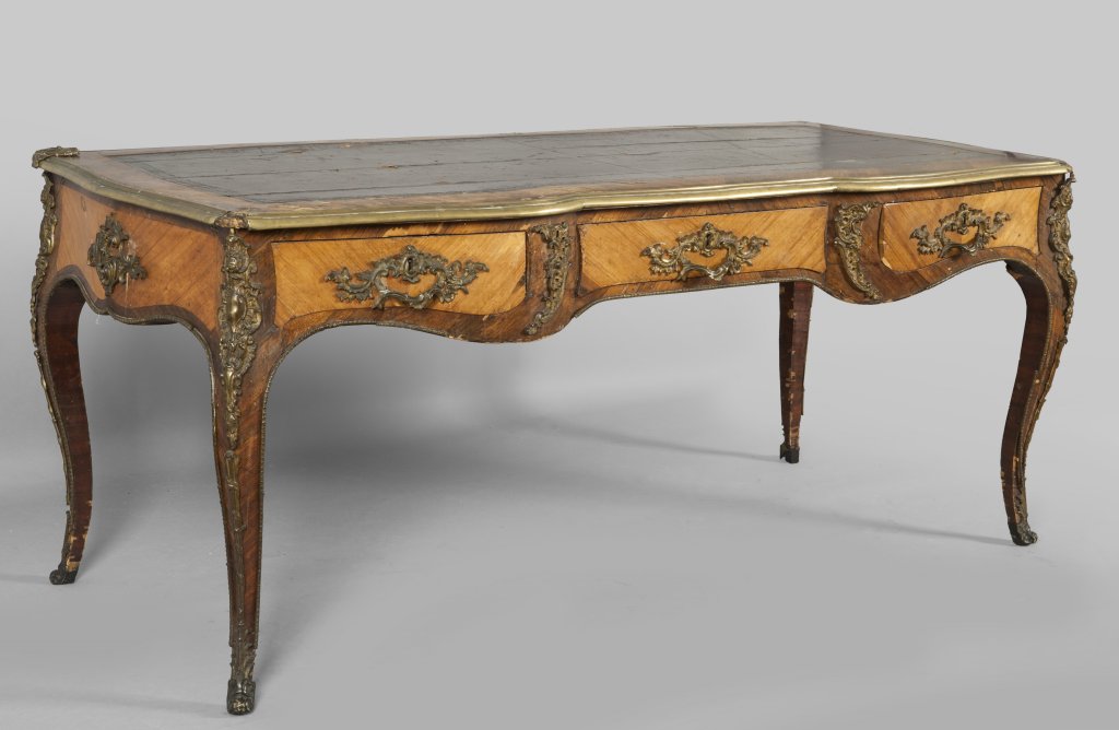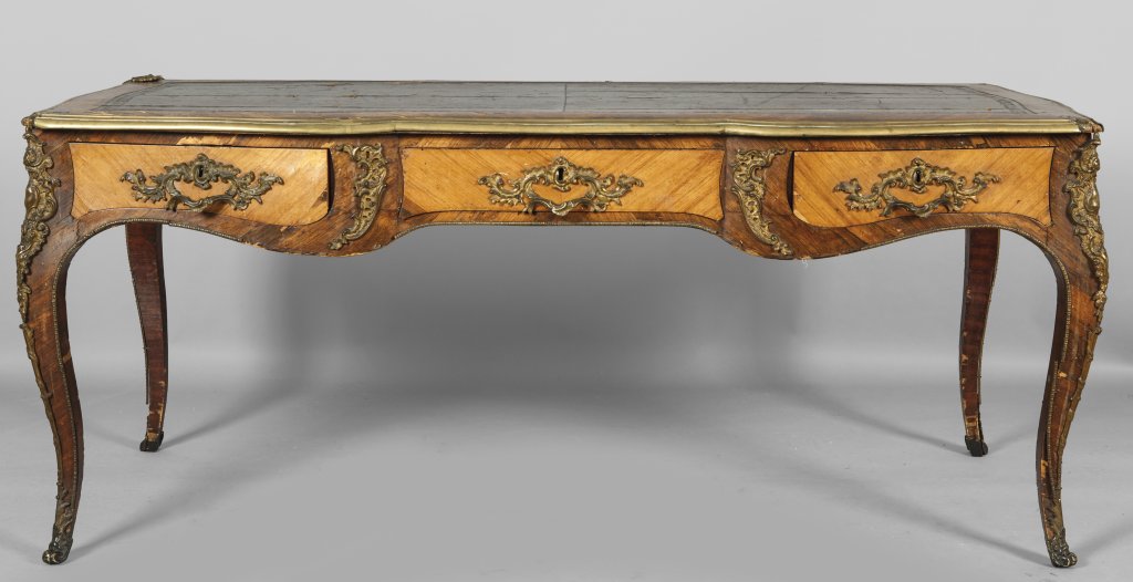 Diplomatica a tre cassetti lastronata in legni vari, ricca decorazione in bronzo, piano in pelle, Francia sec.XIX (mancanze nei bronzi)