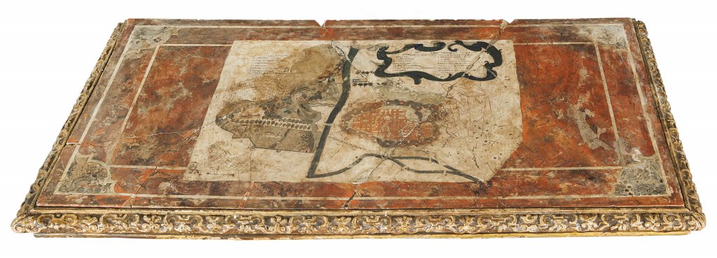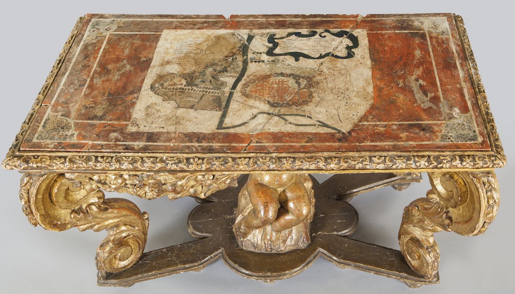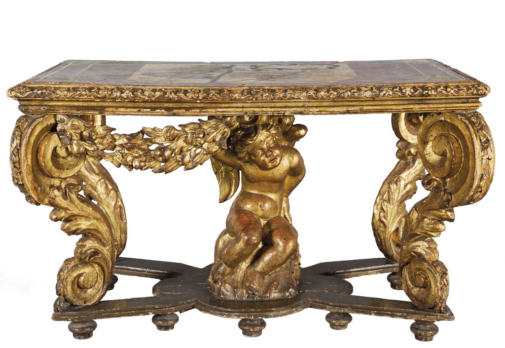 Console barocca in legno intagliato e dorato, gambe a volute con putto centrale, piano in scagliola policroma con la pianta della citta di Torino, Piemonte inzi sec. XVIII (mancante di un festone, rotture nel piano di scagliola)