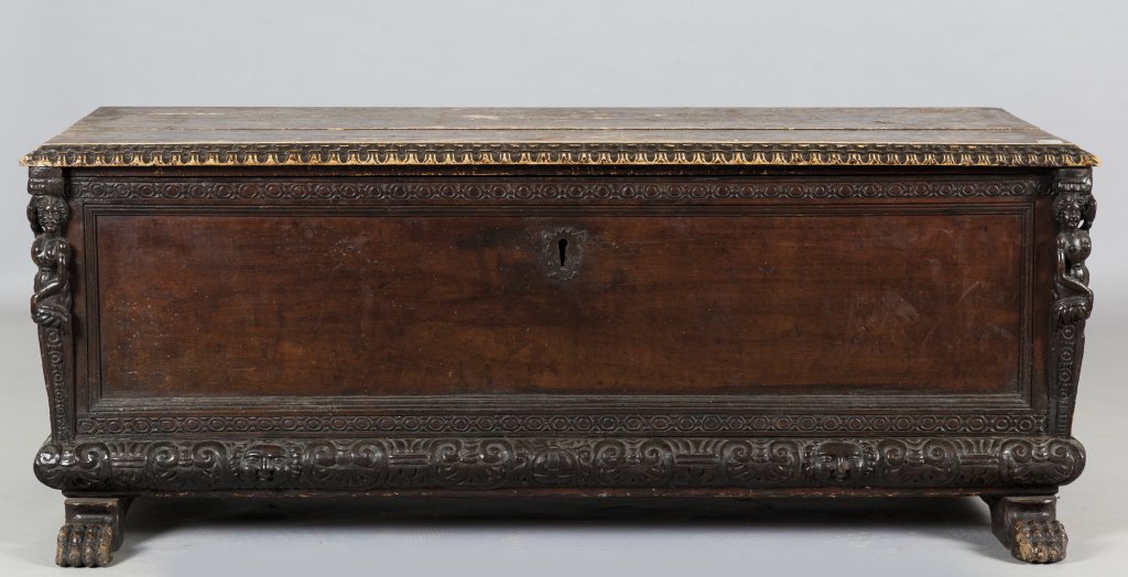 Cassapanca con laterali a bambocci in noce, Genova sec. XVII (coperchio...