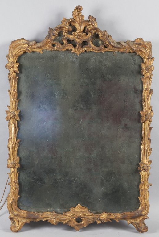 Specchiera Luigi XV in legno finemente intagliato e dorato, Genova sec. XVIII(luce coeva)