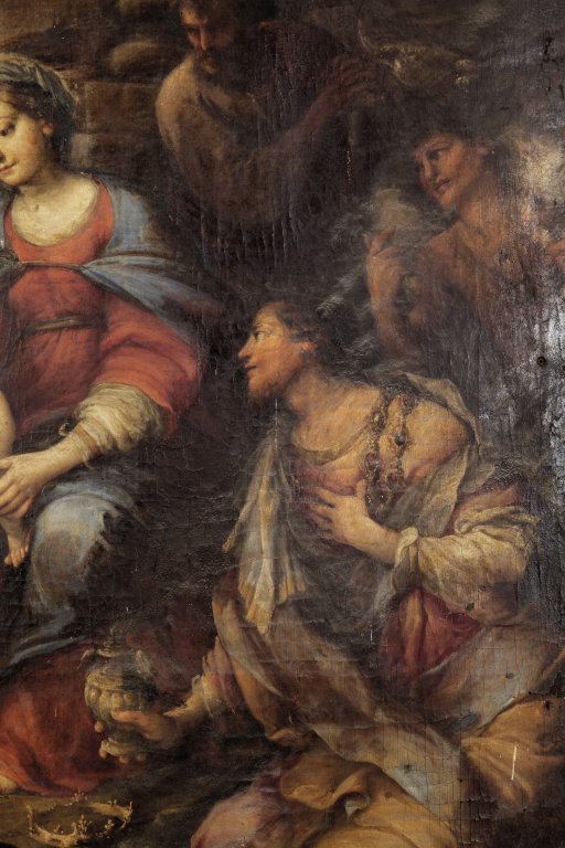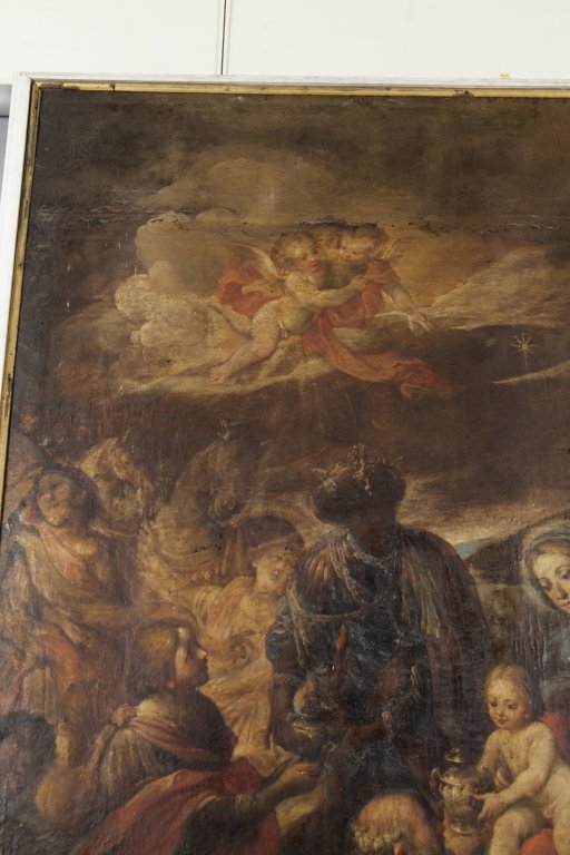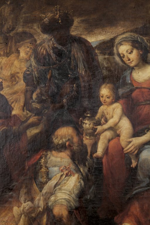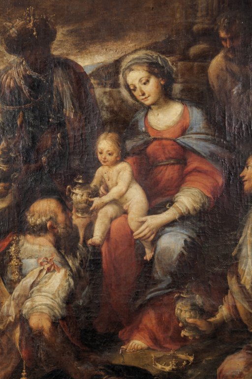 Al centro, la Vergine col Bambino sono illuminati da una luce particolare e costituiscono il perno compositivo. Attorno a loro, su tre lati, sono disposte le figure dei Magi, secondo una regia abbastanza singolare, che non li vede in processione l'uno dietro l'altro, come più consueto, ma quasi a creare un vortice attorno alla figura di Gesù. Il che non fa che rendere la narrazione sensibilmente dinamica. La loro diversa postura e il loro differente atteggiarsi nei confronti di Maria e Gesù conferisce altresì un senso di naturalismo, a cui contribuiscono poi tutti i dettagli. Se ne scorgono moltissimi sotto gli strati di appesantimento della vernice e del colore, e quindi possiamo solo immaginare lo squillare delle tinte e lo scintillare dei dettagli -per esempio dei gioielli e degli argenti-, una volta che il dipinto sarà sottoposto a restauro.