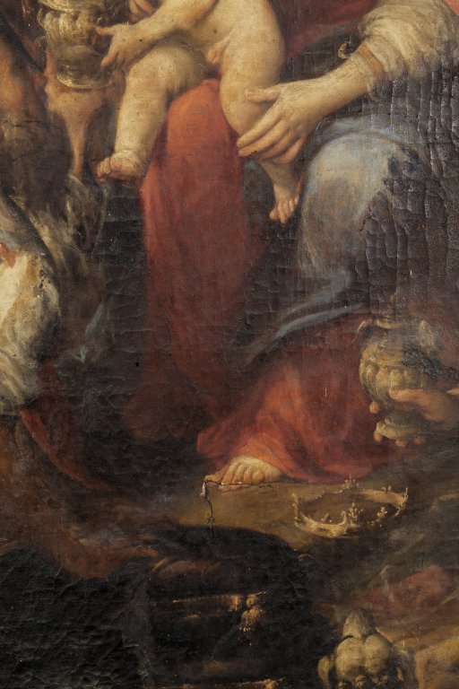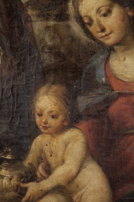 La grande tela si presenta appesantita da vecchi strati di vernice e alterata rispetto alla sue misure originali, che dovrebbero essere state inferiori in alto e in basso, dove la tela è stata giuntata con due superfici utili probabilmente a inserirla in un contesto di quadreria.