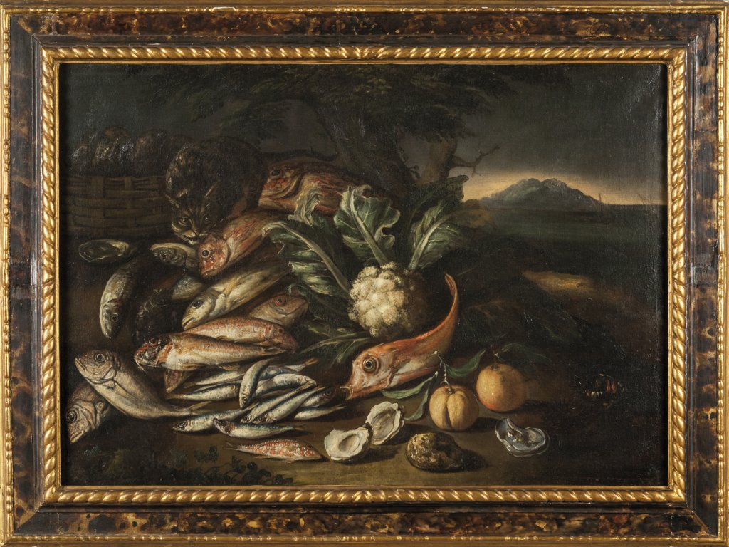 E.Recco (sec.XVII/XVIII) "Natura morta con pesce e gatto" olio