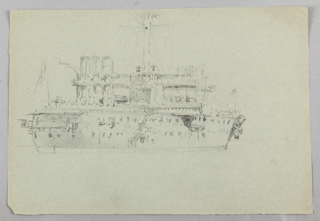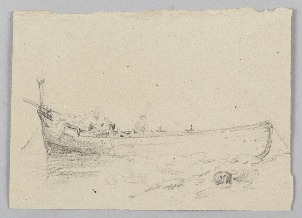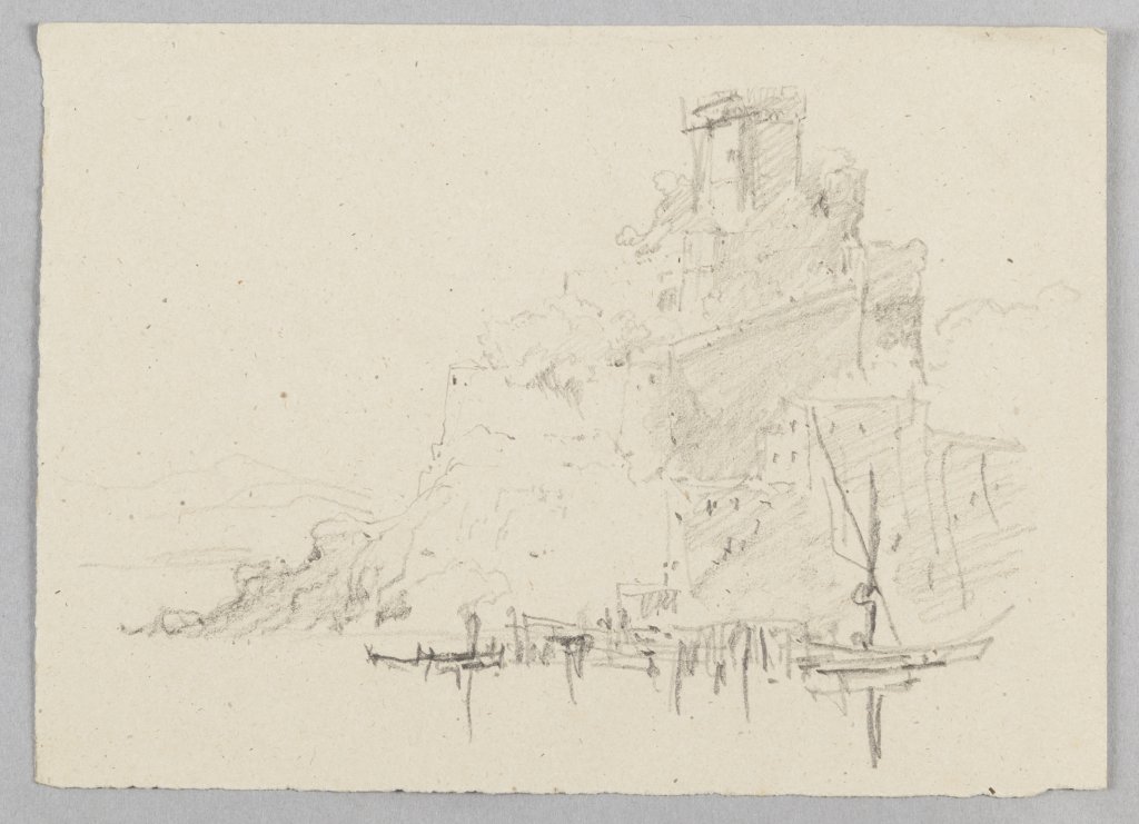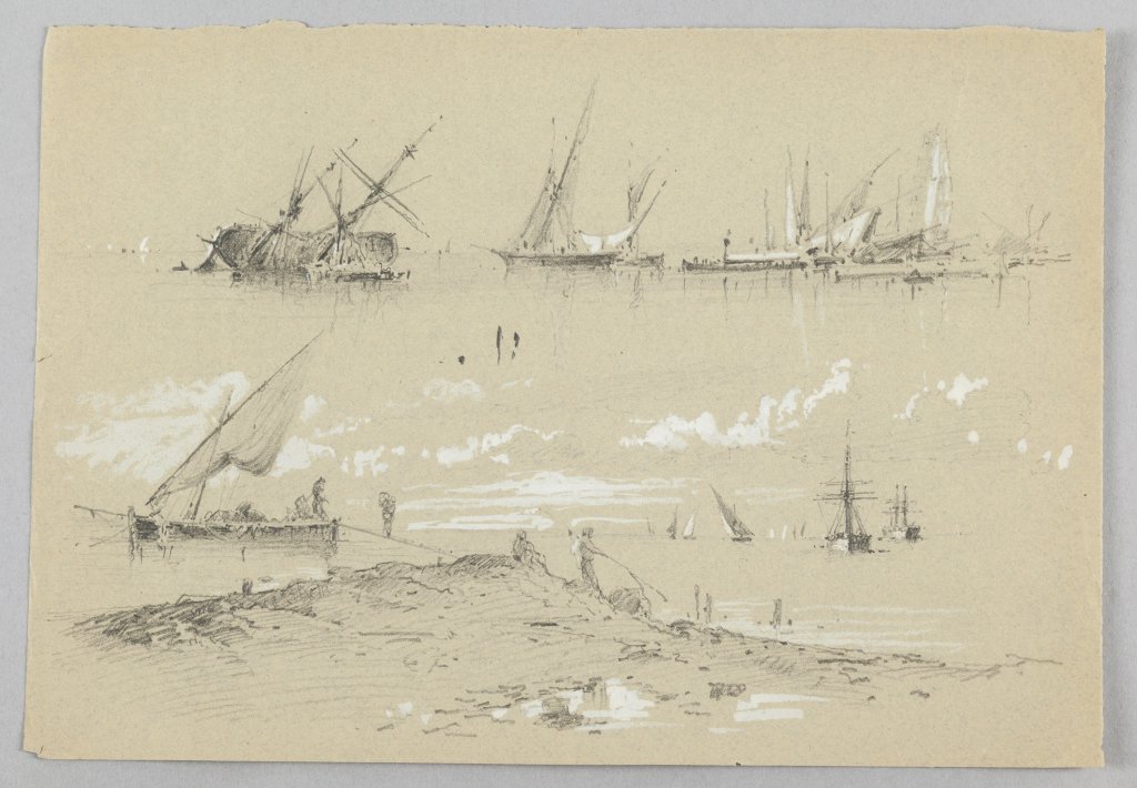 Cartella contenente 10 disegni non firmati raffiguranti velieri e paesaggi