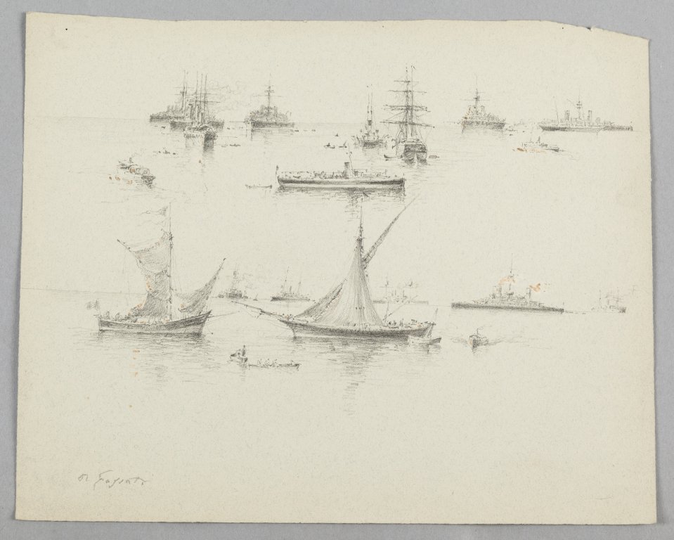 Cartella contenente 10 disegni firmati raffiguranti velieri e paesaggi