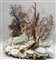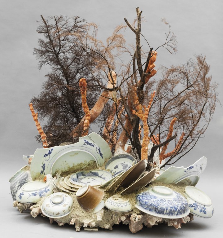 Centrotavola in corallo con frammenti di tazzine in porcellana di Cina bianca e blu e rami di corallo