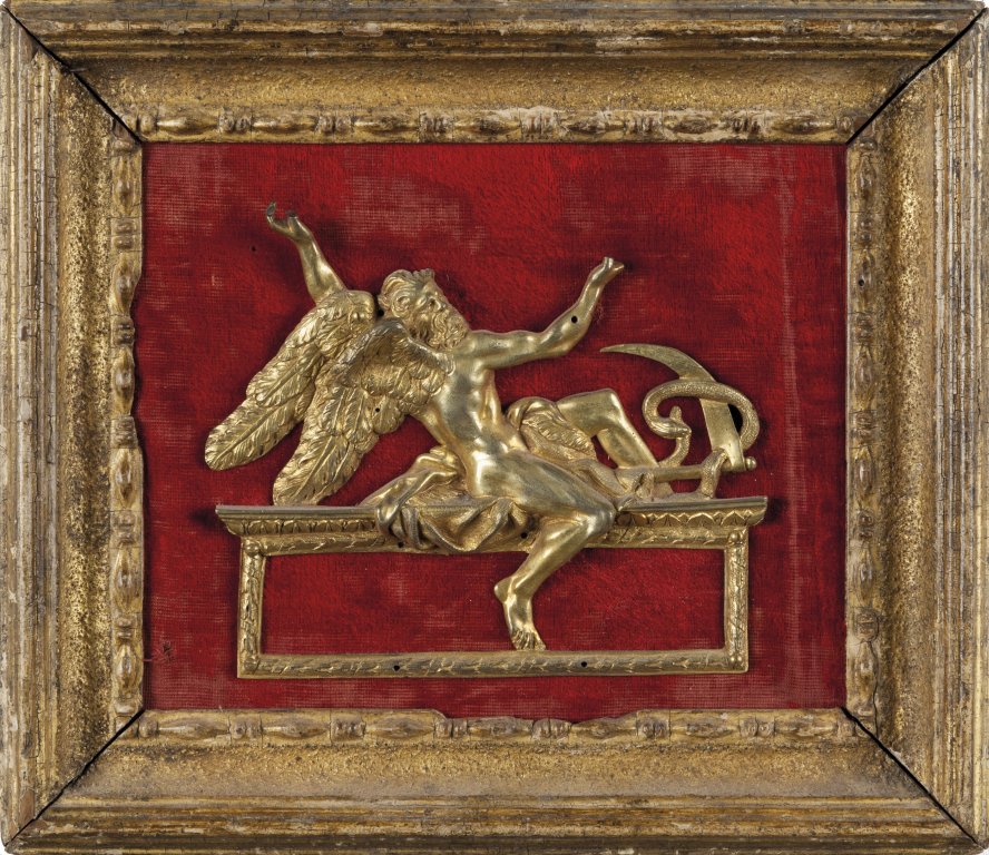 Allegoria del tempo, placca in bronzo dorato, cornice in legno dorato, sec.XIX