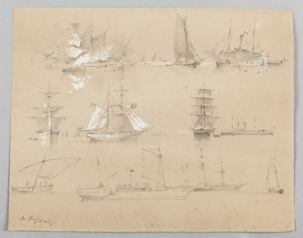 Cartella contenente 10 disegni firmati raffiguranti velieri e paesaggi