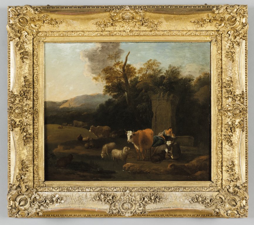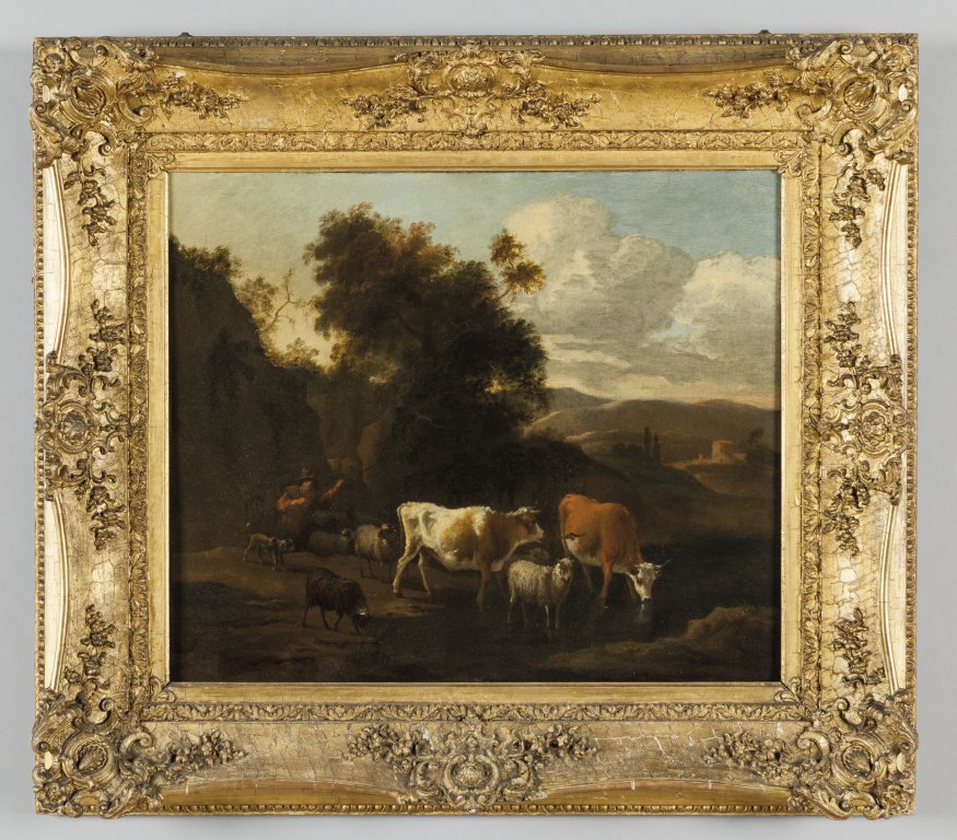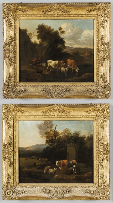 Scuola romana sec.XVIII "Paesaggi con armenti e contadini" coppia di olii