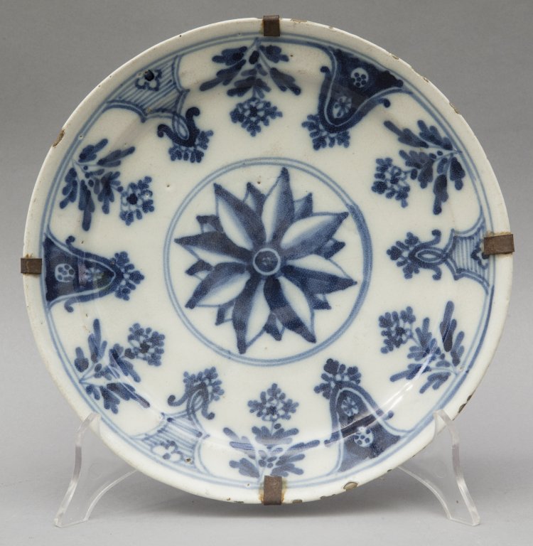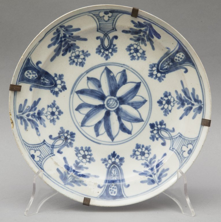Coppia di piatti in maiolica bianca e blu, marca Lanterna, Savona inizi sec.XVIII