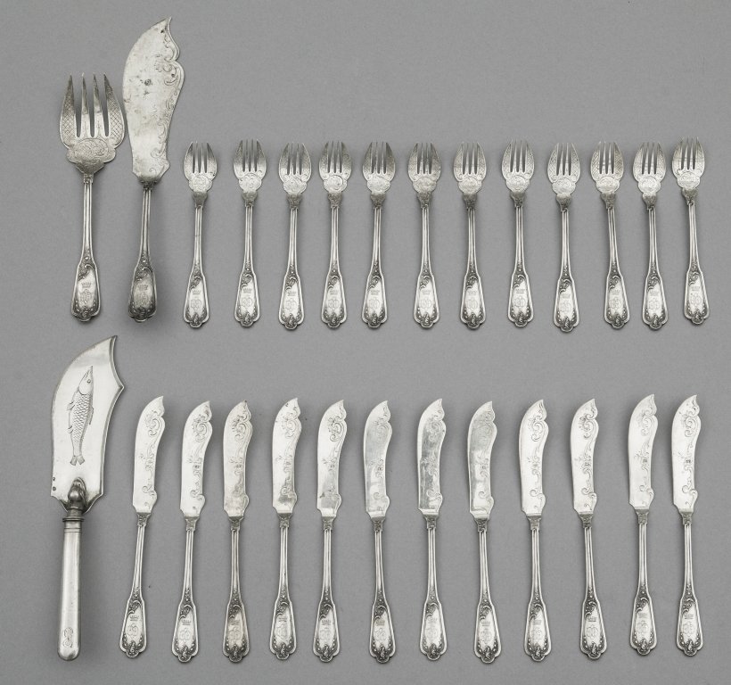 Servizio di posate da pesce in argento composto da da due posate da portata, 12 forchette e 12 coltelli sec.XIX e coltello da portata in argento con attacco a delfino e pesce inciso (tot.gr.1400)