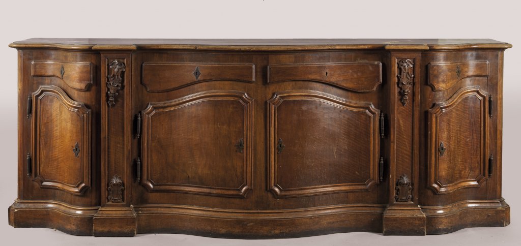 Grande credenza in noce mossa sul fronte a quattro sportelli e quattro cassetti, vecchio artigianato Veneto