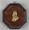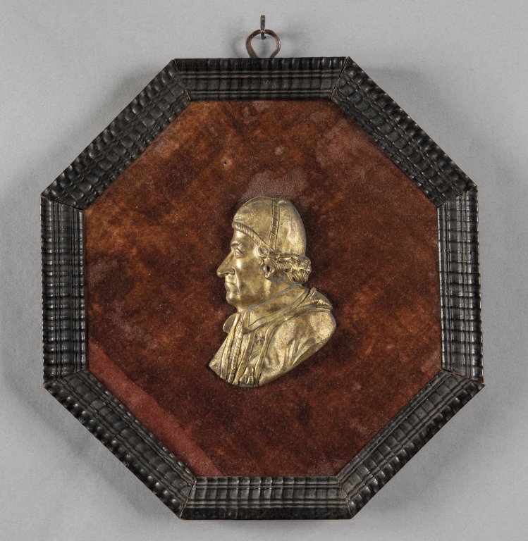Profilo in bronzo dorato raffigurante Papa Clemente XI, montato su pannello ottagonale in velluto, sec.XVIII
