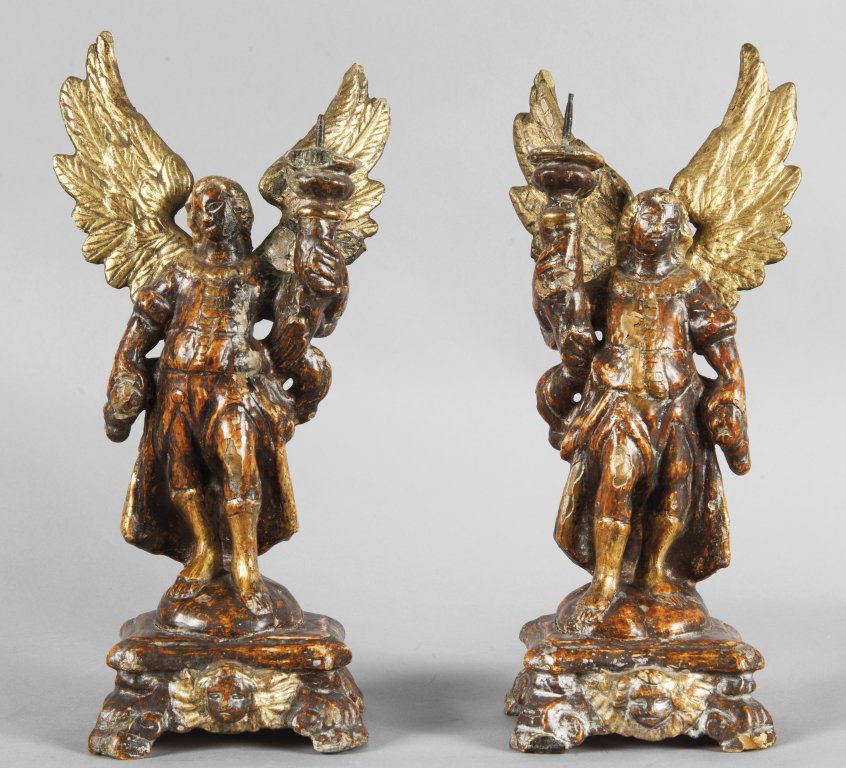 Coppia di angioletti portacero in legno intagliato e dorato, sec.XVIII